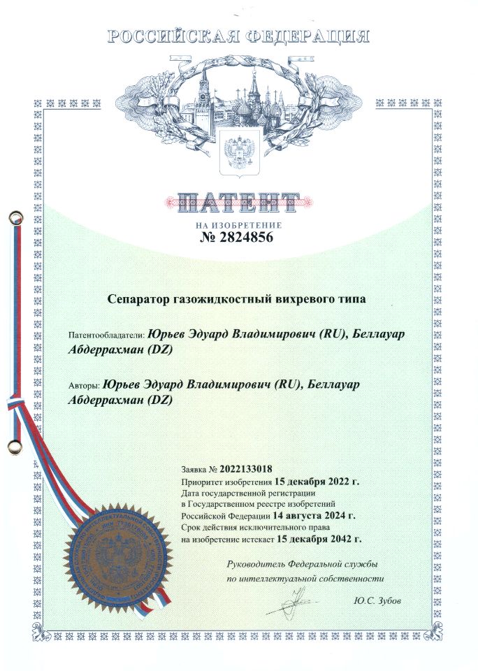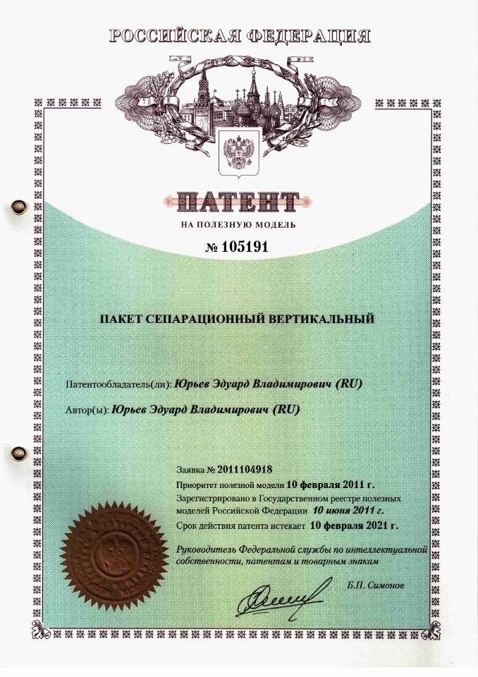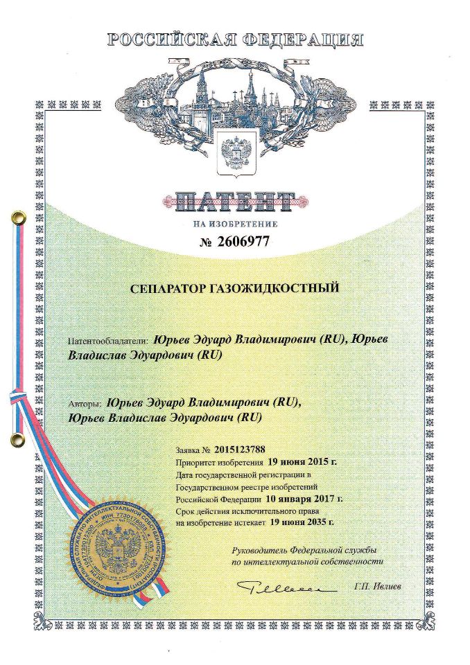 Нами получены более 45 патентов на наши разработки, в частности на газовые сепараторы, технологию модернизации сепараторов, вихревую трубу и другие.