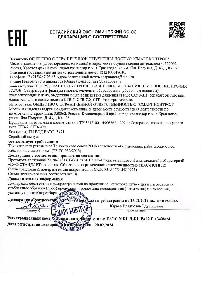 Использование сепараторов СГВ-7 для очистки газа позволяет получить газ, очищенный от капельной жидкости и механических примесей с минимальным содержанием примесей. Это позволяет обеспечить надежную работу оборудования и стабильность технологического процесса.